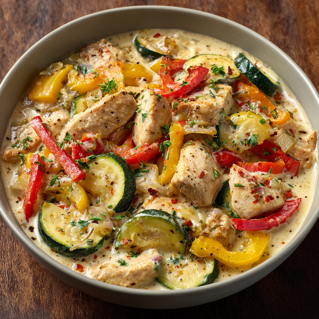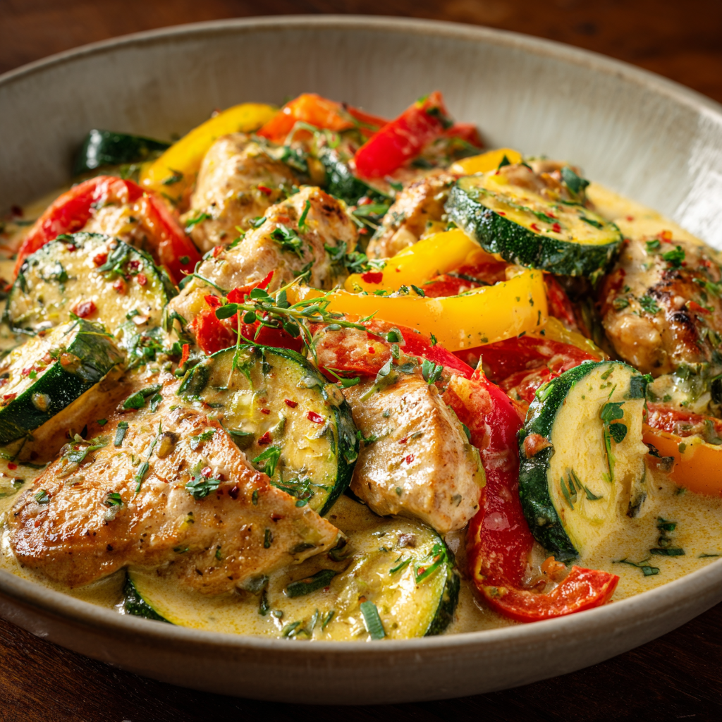 Cremiges Hähnchen mit Paprika und Zucchini