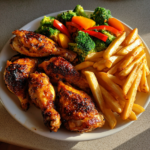 - Servieren: Pommes Frites, Hähnchenschenkel und Gemüse heiß servieren.